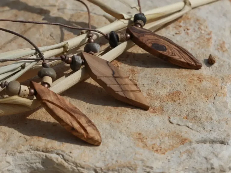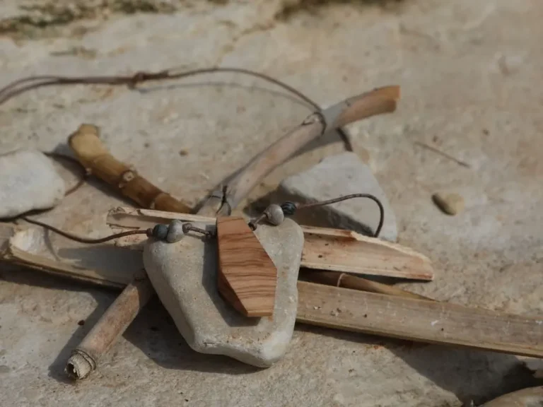 Feinporige Hölzer, Stein- und Kokoselemente, etwas Kupfer, dazu Leder oder gewachste Baumwolle.
