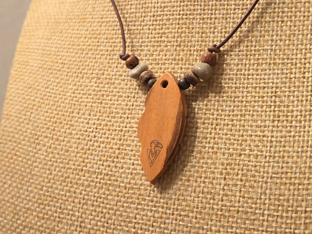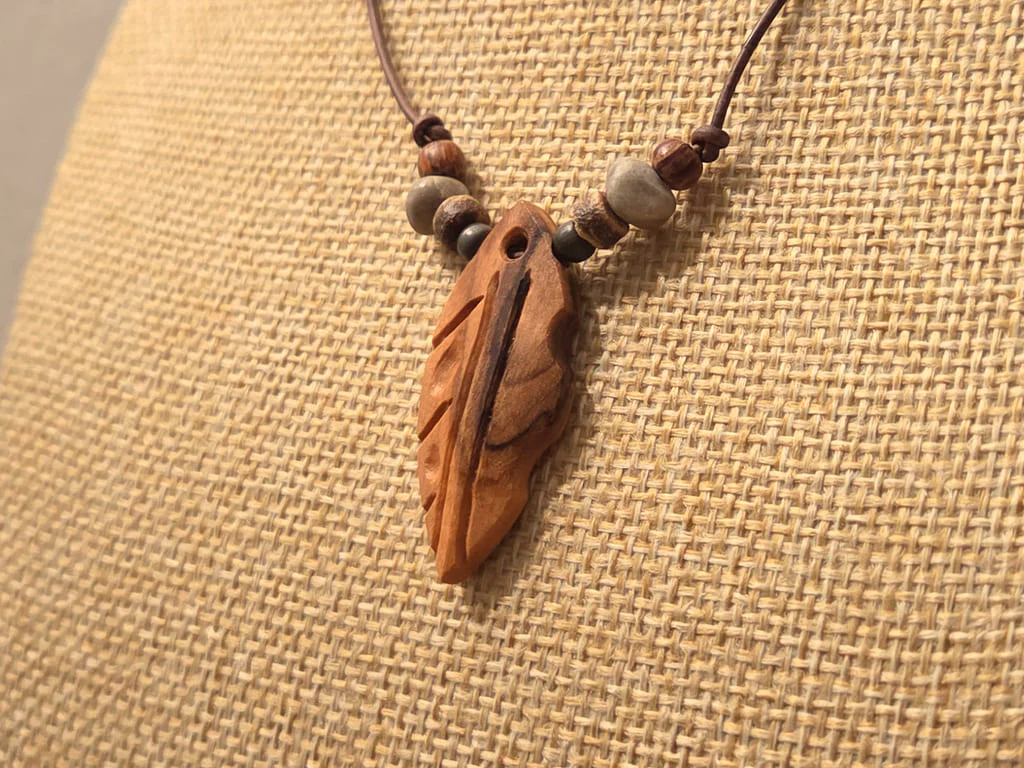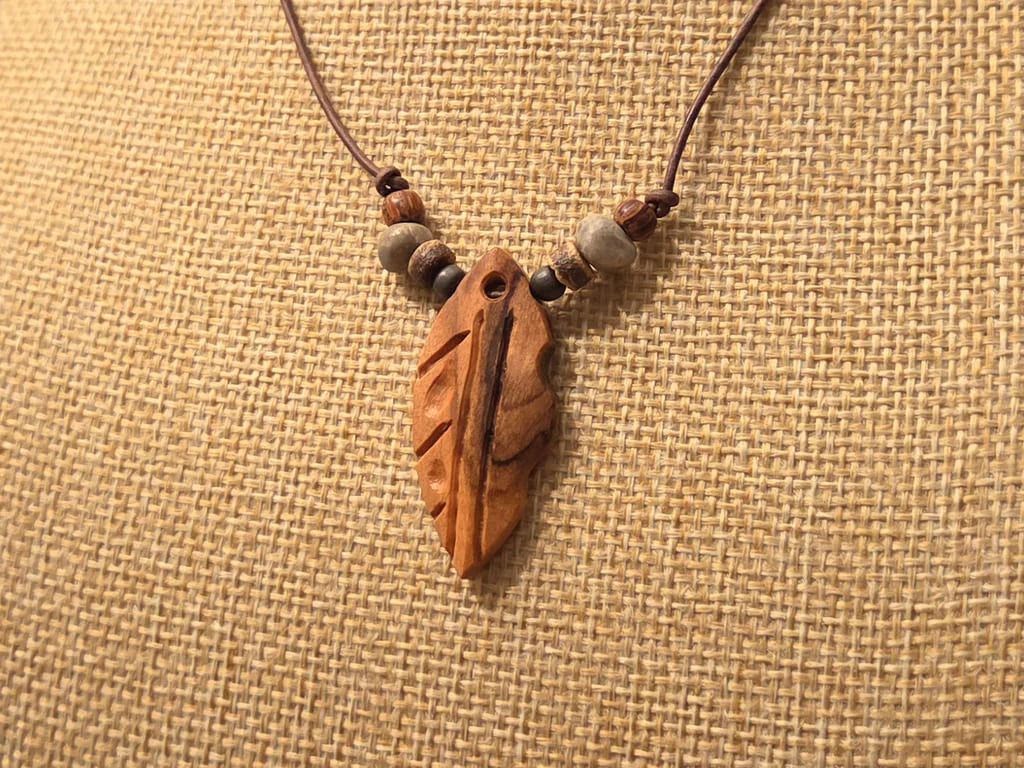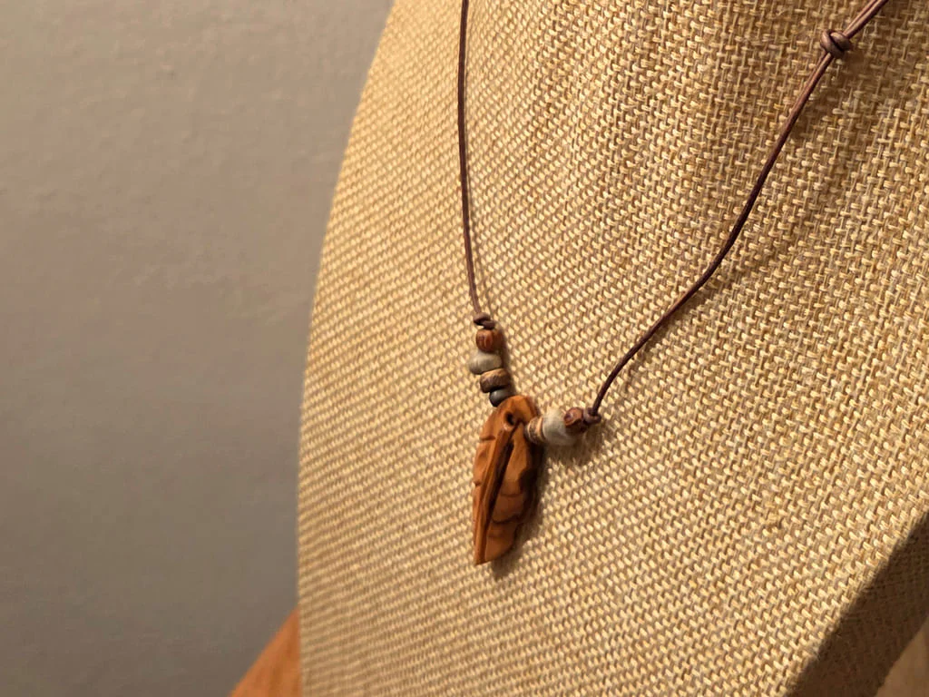 Mit dem Anhänger dieser Kette habe ich mich an einer natürlichen Blattform orientiert. Die Schnitzungen laufen längs und trennen die ruhigere von der kräftigeren Maserung. Dadurch wirkt das Ganze zweigeteilt, aber trotzdem stimmig.