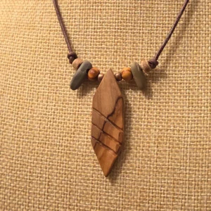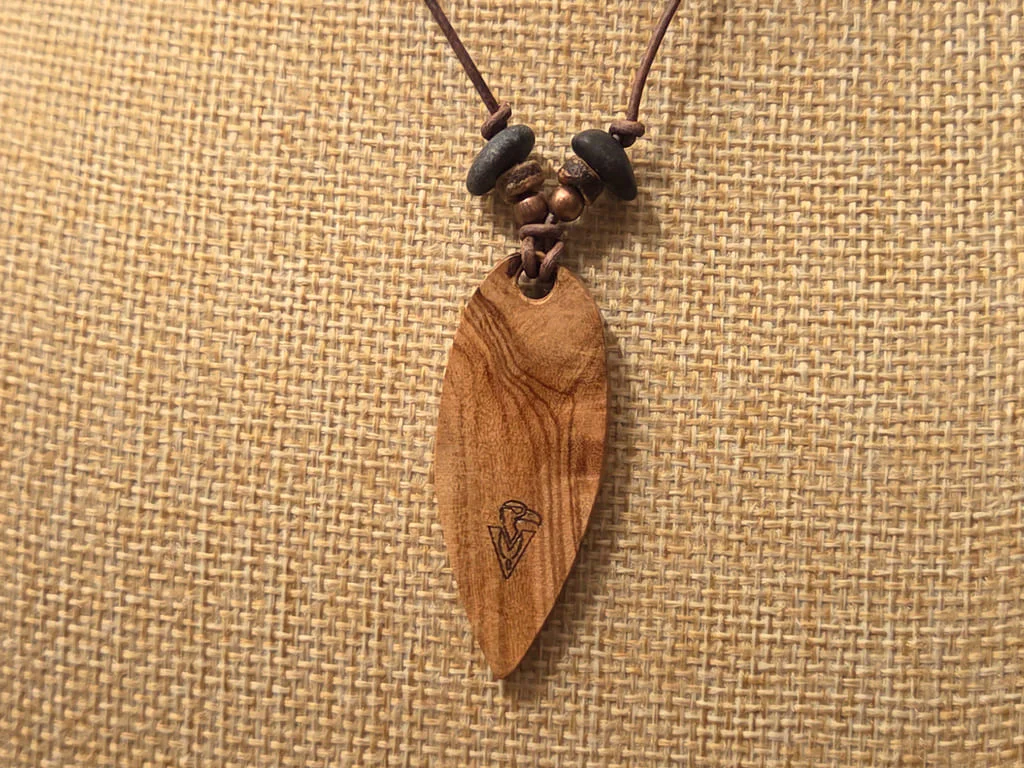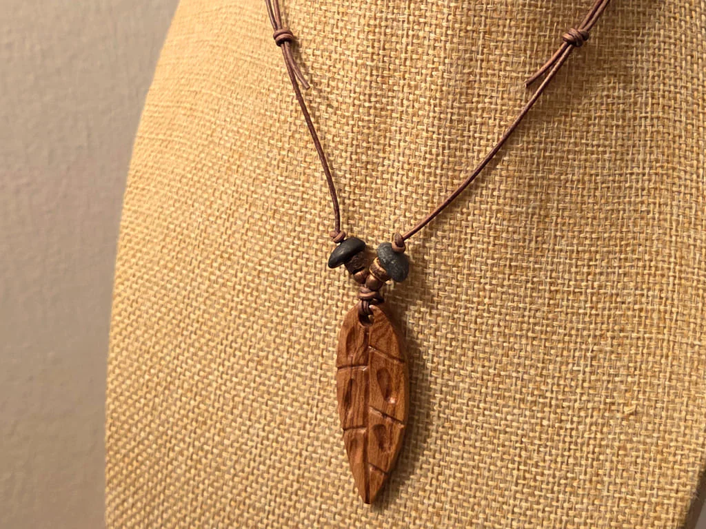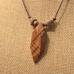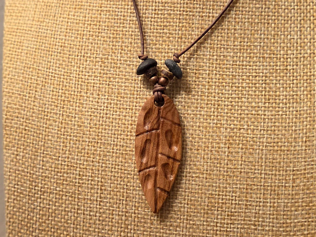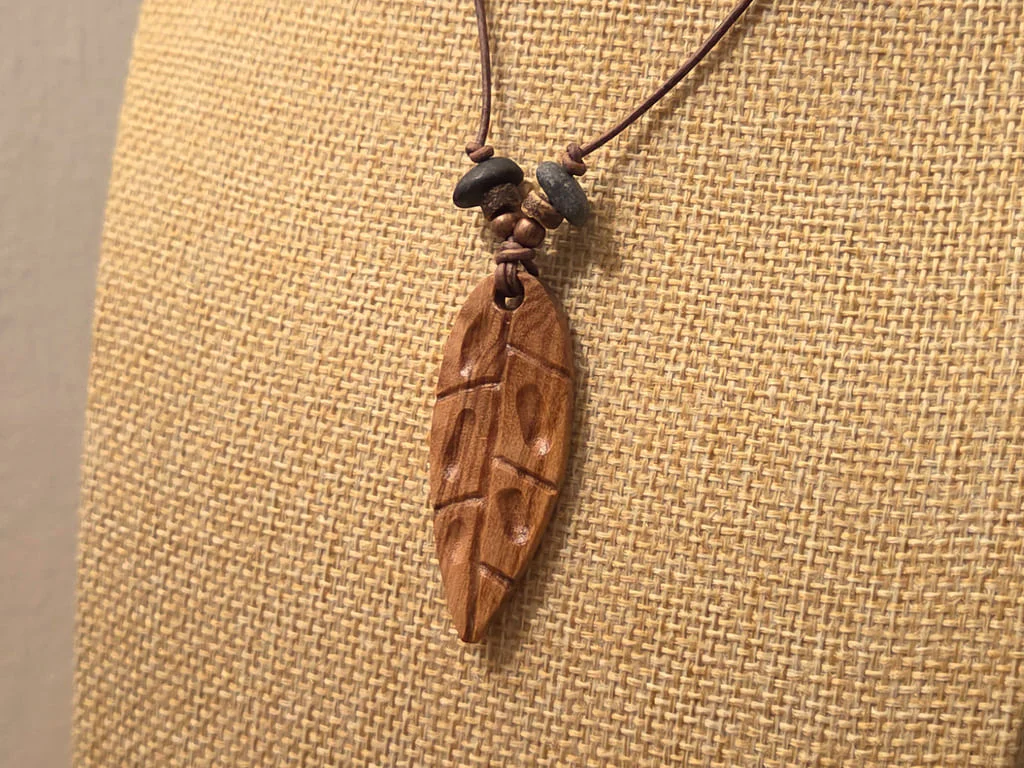 Der Anhänger ist an eine natürliche Blattform angelehnt. Die etwas dezentere Maserung läuft ruhig durch und wird von den schrägen Schnitzungen gekontert. Die so entstandenen, ungleichmäßigen Segmente geben dem Anhänger einen eher organischen Stil.