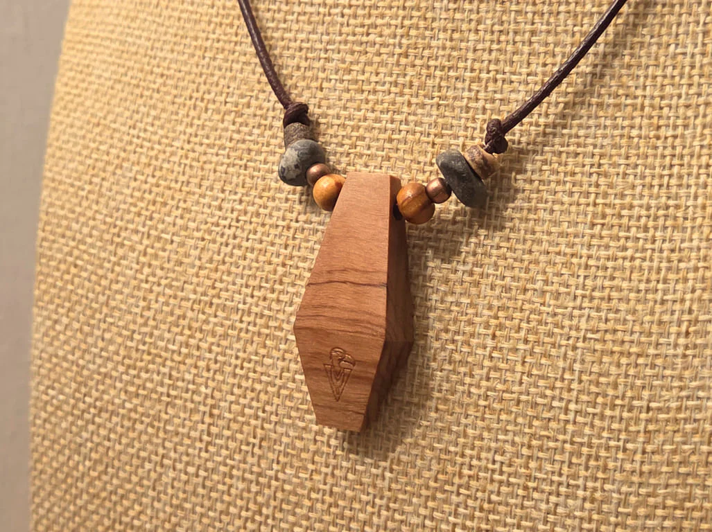 Ein kompakter und kantiger Anhänger, welcher insgesamt einer Tropfenform ähnelt. Die Form ist unten breiter und läuft nach oben schmaler zu. Keine Schnitzungen, einfach sauber geschliffen.