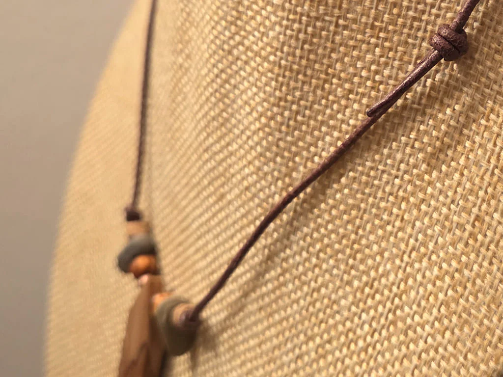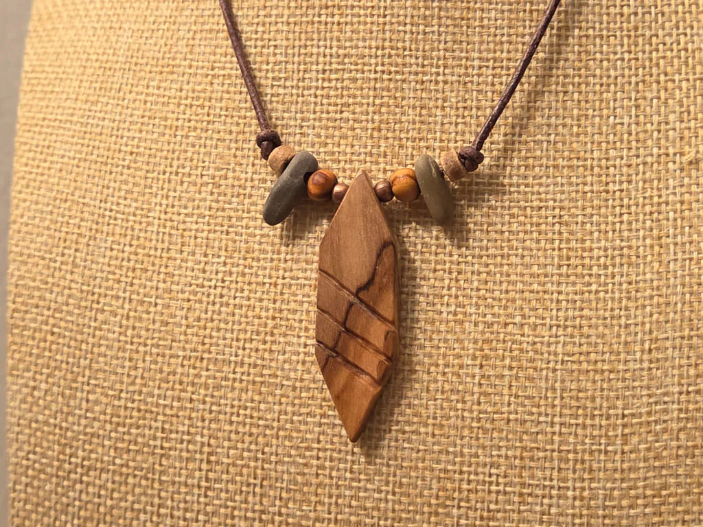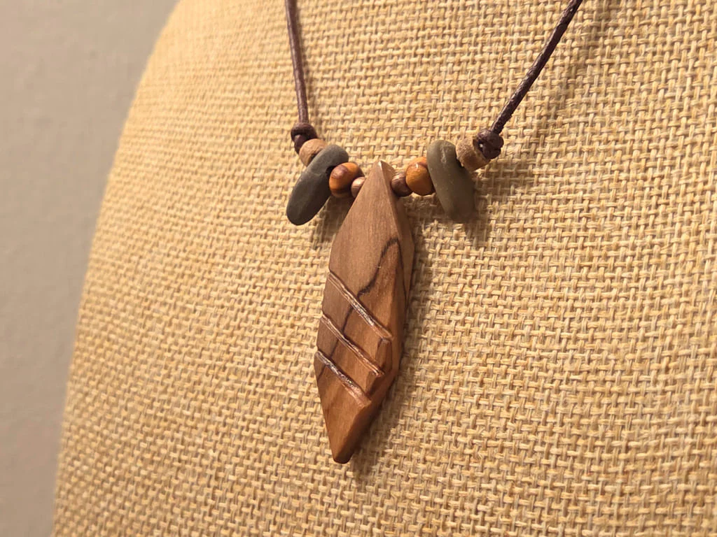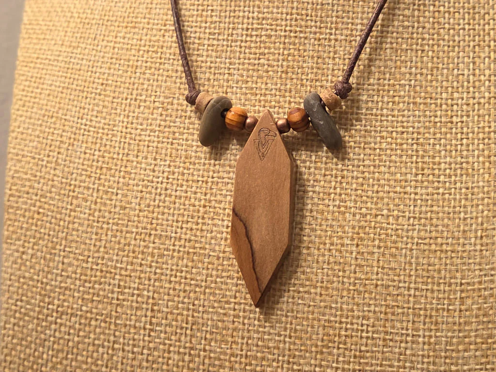 Dieser kantige Anhänger hat eine längliche Sechseck-Form. Die Maserung ist etwas kräftiger und wird von den Schnitzungen gekreuzt, welche schräg über den Anhänger verlaufen. Durch die ausgeprägte dunkle und helle Maserung wirkt die Kette etwas markanter.