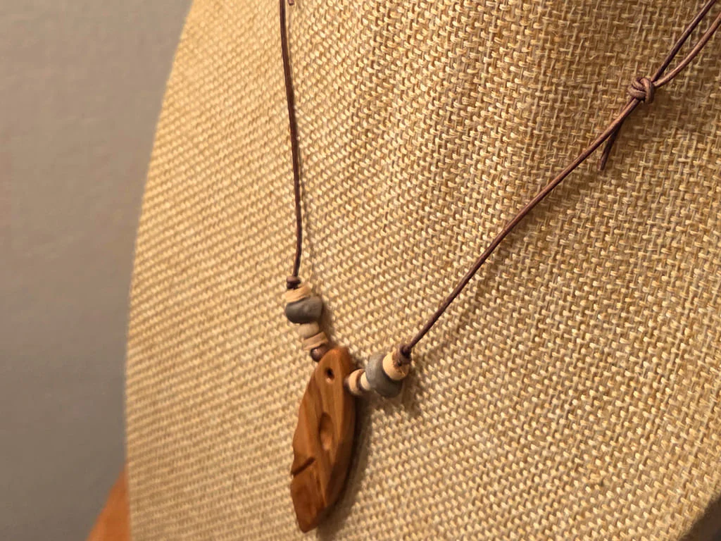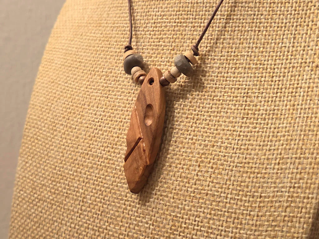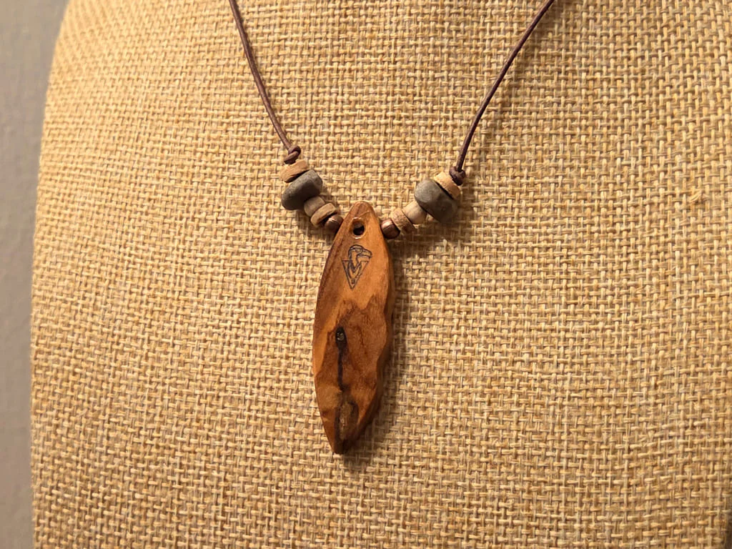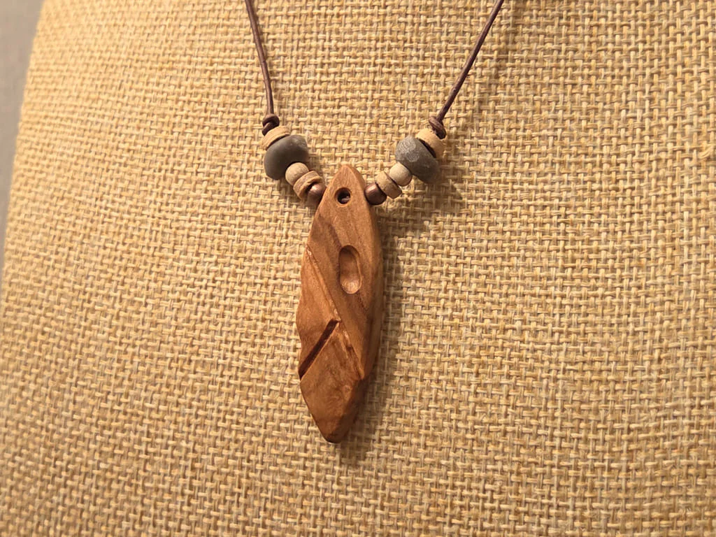 Der Anhänger dieser Kette ist aus etwas dunklerem Olivenholz, die Maserung ist dabei nicht zu sehr ausgeprägt. Mit der langen Schnitzung, welche quer über den gesamt Anhänger verläuft, habe ich mich an der darüber liegenden Maserung orientiert. Die Einbuchtung darüber ist genau zwischen dem dunklen und hellen Maserungsbereich erfolgt und setzt damit einen schönen Akzent.